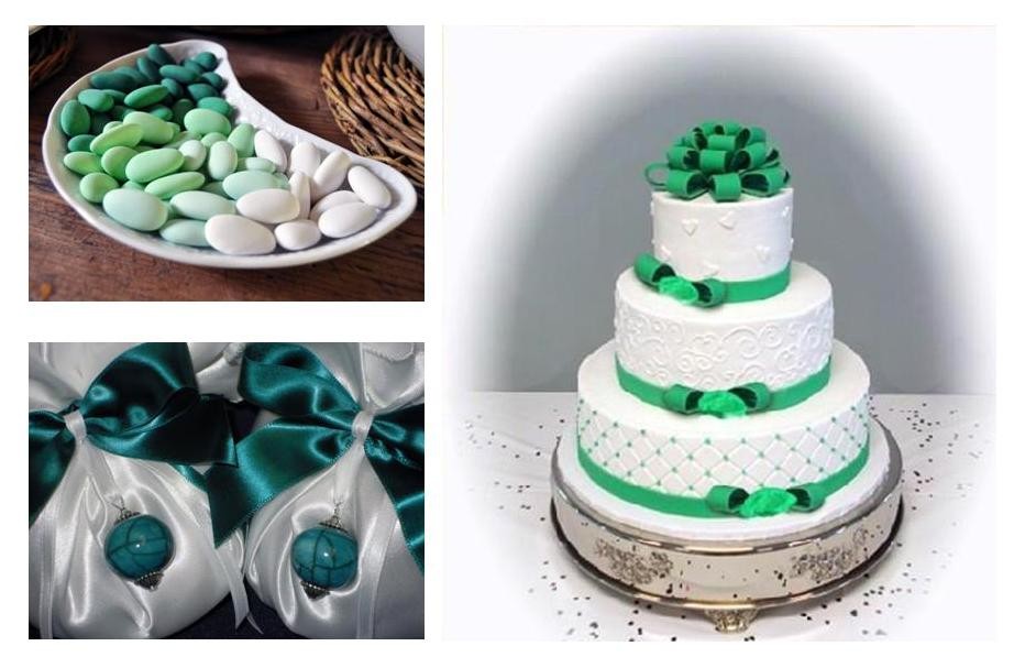Il tavolo della confettata sarà un tripudio di verde smeraldo se si sceglierà di abbinare ai classici confetti bianchi quelli nelle nuances del verde. Ed anche i sacchettini con i confetti saranno bellissimi se impreziositi da ciondoli e nastri di raso color smeraldo.